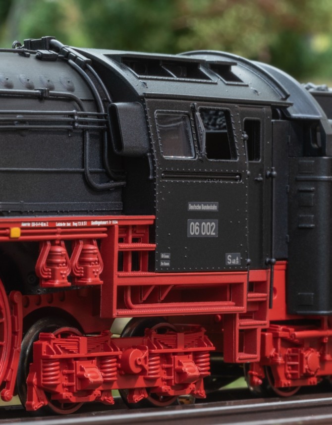 Märklin und TRIX setzen die Pläne von damals ins die Realität um und bringen die 06er als Modell frühen Epoche 3. Dabei wurde vor allem viel Wert auf die Ausführung des langen Fahrwerkes gelegt. Nach einigen Problemen mit dem Fahrwerk der verkleideten 06 001 vor einigen Jahren, geht nun ein Modell mit völlig neu konstruiertem Fahrwerk in Serie das auch das Durchfahren von kleinen Radius 1 (360 mm) ermöglicht!.