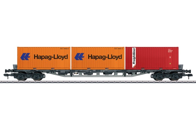 Der Standard-Tragwagen des Typs Sgjs716 für Container in der Epoche 4. Das Modell besitzt drehbare Rungen und separat angesetzte und abnehmbare Stirnborde. Die Container sind abnehmbar und die Türen lassen sich öffnen. Der Fahrzeugrahmen des Wagens besteht aus Metall, das verleiht dem Wagen einen sehr niedrigen Schwerpunkt, was sich wiederum positiv auf die ruhige Laufweise des Wagens auswirkt.