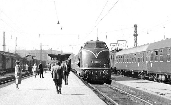 Die V200 002 mit einem Schnellzug im Jahr 1958. Copyright: Helmut Röth / Slg. Eisenbahnstiftung